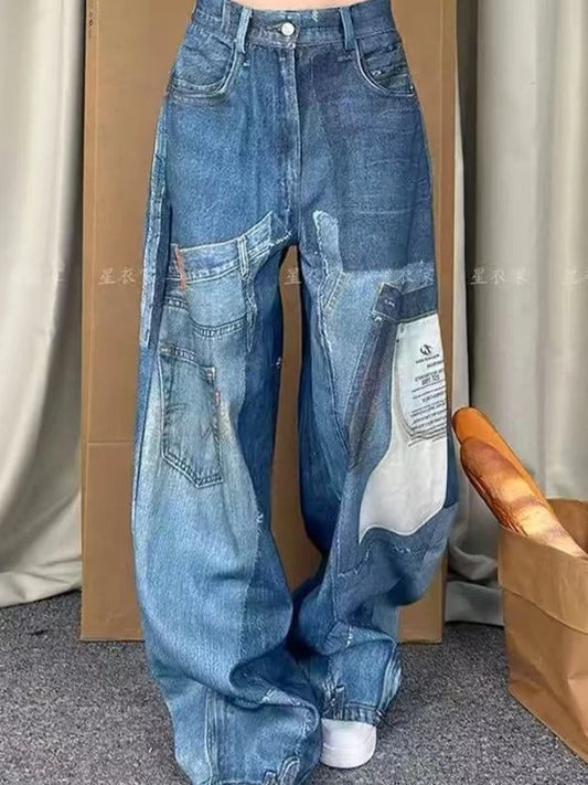 Jean large femme style Y2K – jean taille haute oversize, patchwork imprimé, coupe wide leg high street vintage