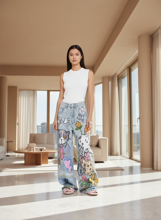 Jean baggy femme Y2K – jean large droit vintage, coupe loose high street avec imprimés doodle, style américain casual