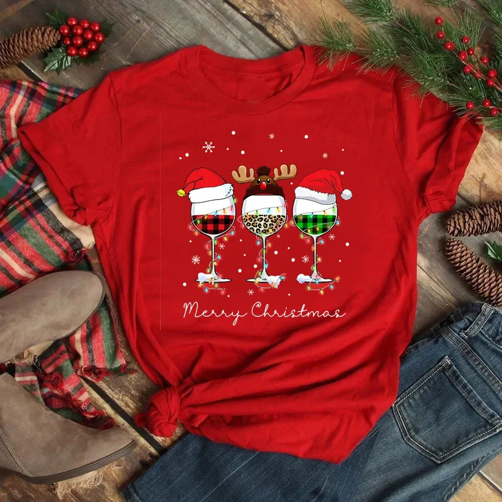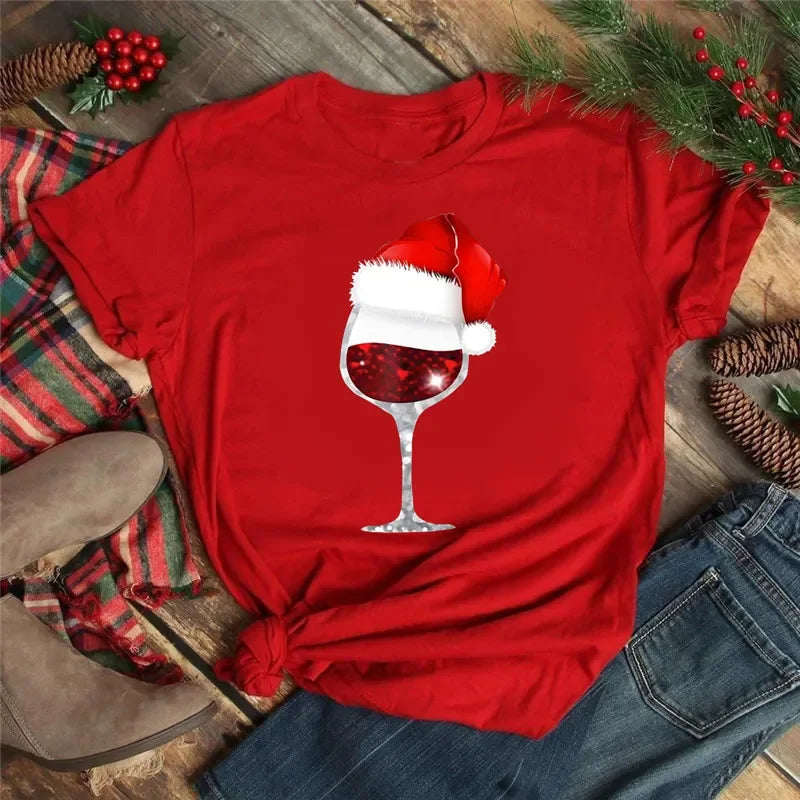 T-shirt Noël femme – t-shirt noir imprimé verre de vin & bonnet de Noël, top festif cartoon style Harajuku, idée cadeau fun